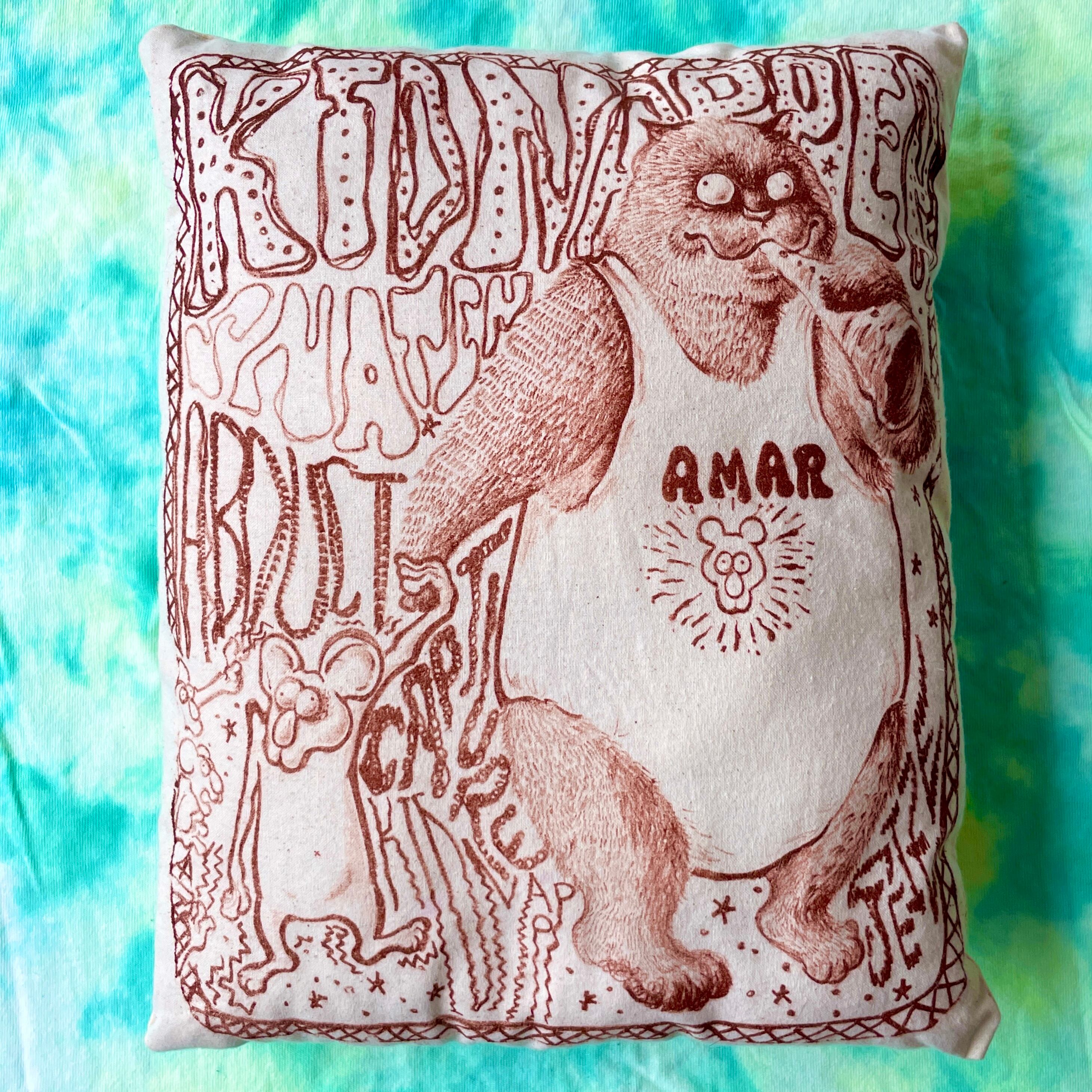 石版画を布に刷り、縫製しクッションにしました。